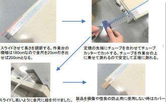 チューブ加工で2mの長さの加工があります。少し離れた場所にある加工用メジャーに移動しての作業でしたが、作業台が1.8mですので作業台に30cmの金尺をスライド式にして据え付ける事で移動せずに加工出来るように改善しました。